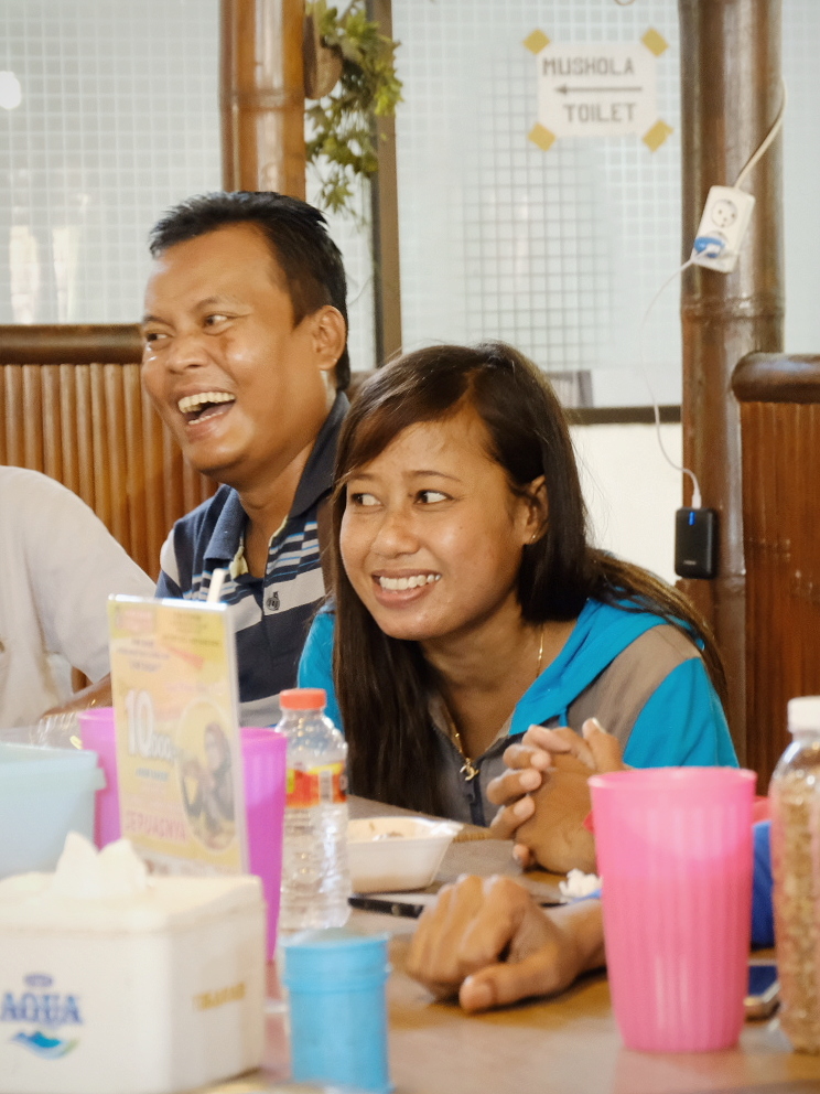 Bertindak sebagai tuan rumah dan yang menyiapkan acara itu adalah Yayuk, Lifah, Yunita. “Wah, cemilan otak-otaknya gurih. Bonggolan ikan khas Gresik uenak tenan,” ujar Ekklesia yang sering dipanggil teman-temannya Sheny.